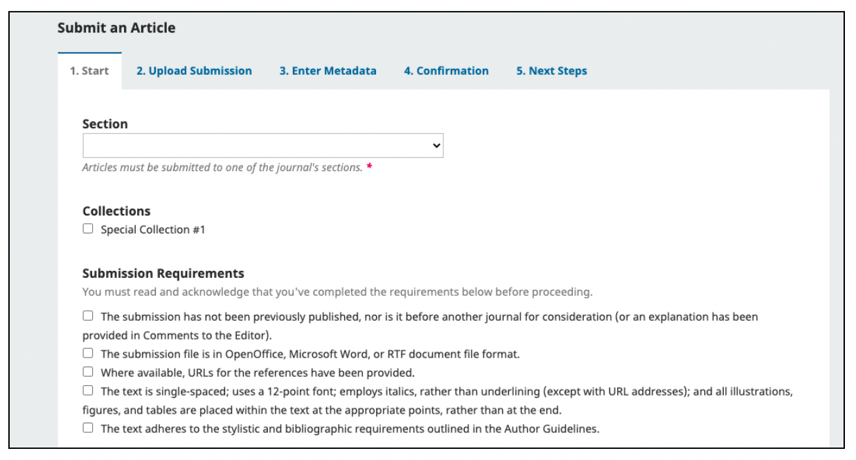 If the journal uses special collections, these are also listed here. If your submission is for one of these special collections, please select it. If your submission is a general one, you can ignore this field.