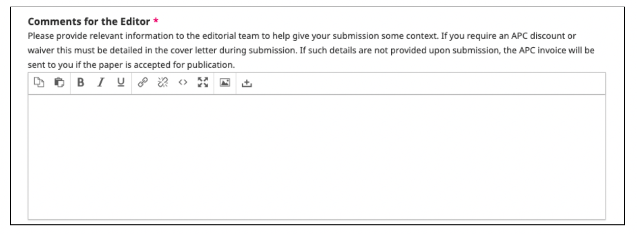 A text box for Comments for the Editor follows. This is in place of a cover letter. Add your comments here and remember to address the points raised in the legend of the text box.