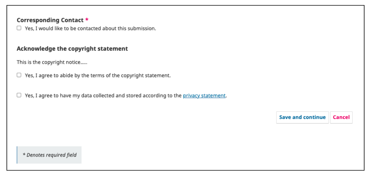 Following this are check boxes confirming that you agree to be the corresponding author on your submission, and checkboxes regarding copyright notice and data collection policy. You need to agree with these statements in order to proceed.
