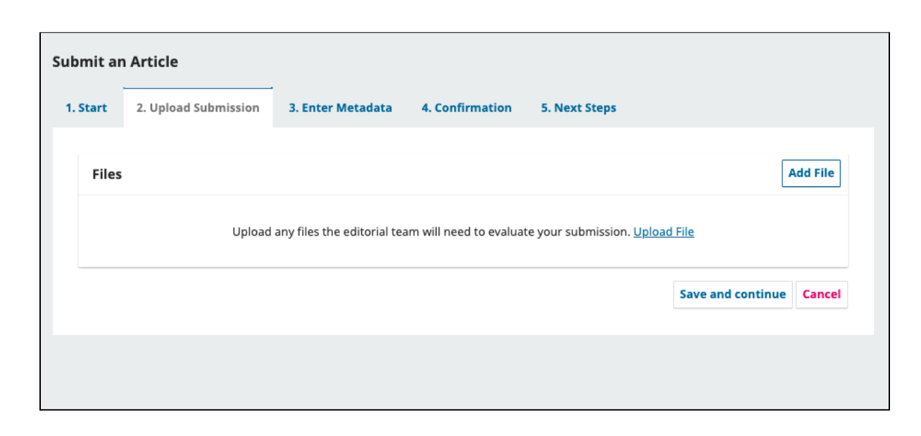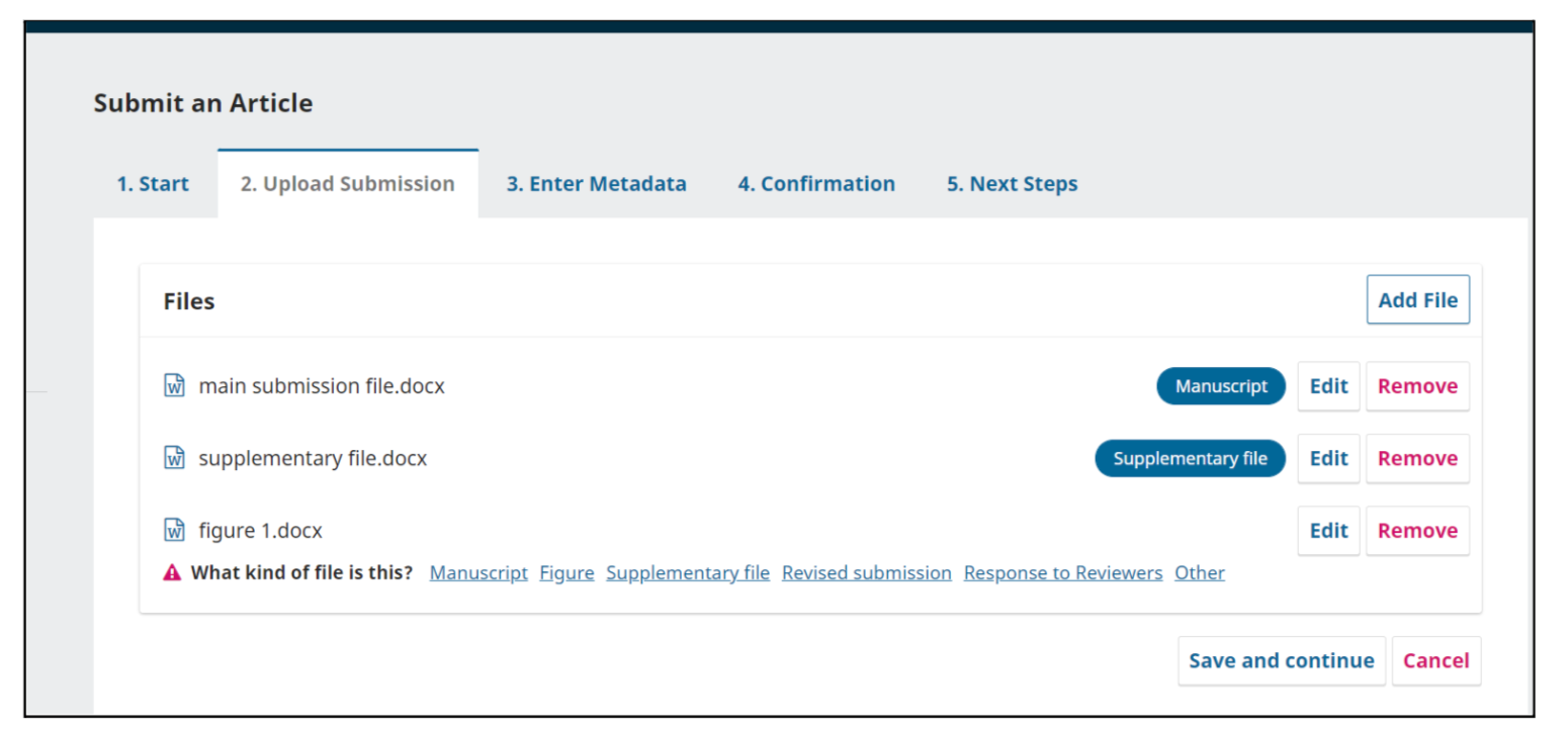 At Step 2 you upload your submission files. Start by clicking on ‘Add File’ or ‘Upload File’. By clicking either option, a new overlay opens where you can choose a file from your computer. Once the file is uploaded it appears in a list where you have the option to mark it as manuscript, figure, or other.