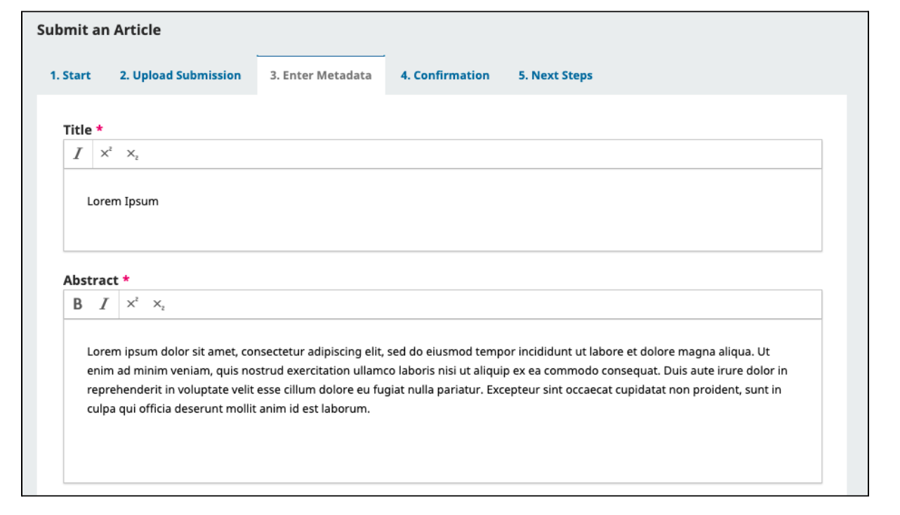 At step 3 you are required to add the submission metadata starting from the title, the abstract, contributors’ names, emails and roles, keywords, preferred and excluded reviewers, competing interests, and funding information. Remember to click ‘Save and Continue’ when you are done.