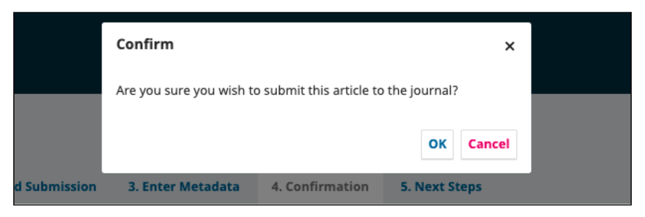 When you click ‘Finish Submission’ a pop-up question asks you to confirm that you are sure that you wish to submit. Click ‘OK’ to complete the submission.