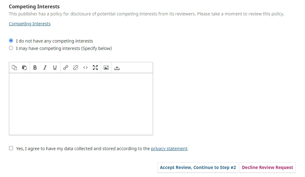 - Once these have been considered and a decision made, please state any conflicts of interest and then accept or decline the invitation at the bottom of the page by clicking on either ‘Accept Review, Continue to Step #2’ or ‘Decline Review Request’.