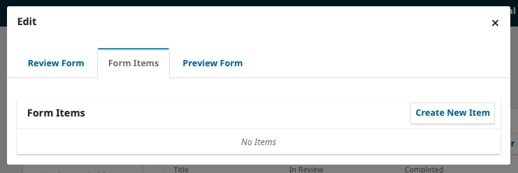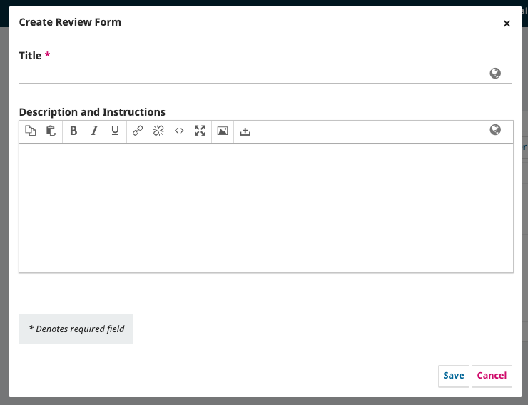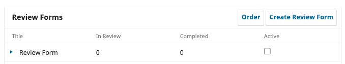 To create a review form, click ‘Create Review Form’, fill in the ‘Title’ and ‘Description and Instructions’ information (this will appear at the top of your review form), then click save