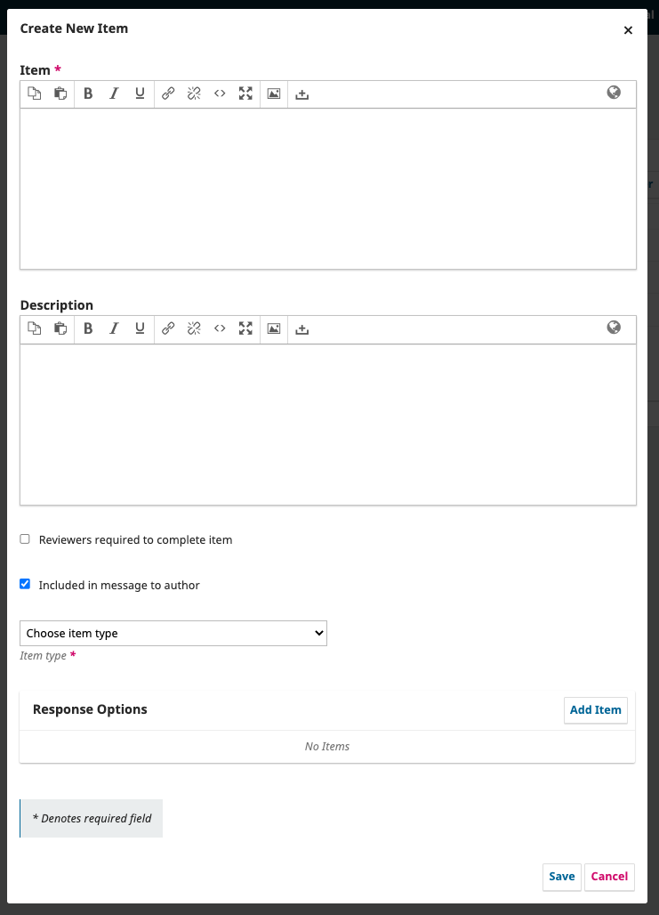 - If you wish the question to be mandatory, so that the reviewer cannot complete the task without giving an answer, enable the ‘Reviewers required to complete item’ option