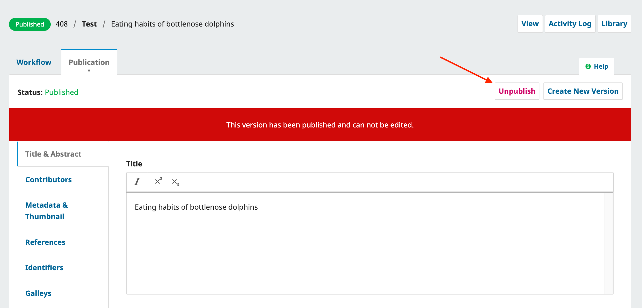 - Click on the ‘Publication’ tab of the article - a red banner will be at the top of the display to confirm that the article is published and cannot currently be edited
