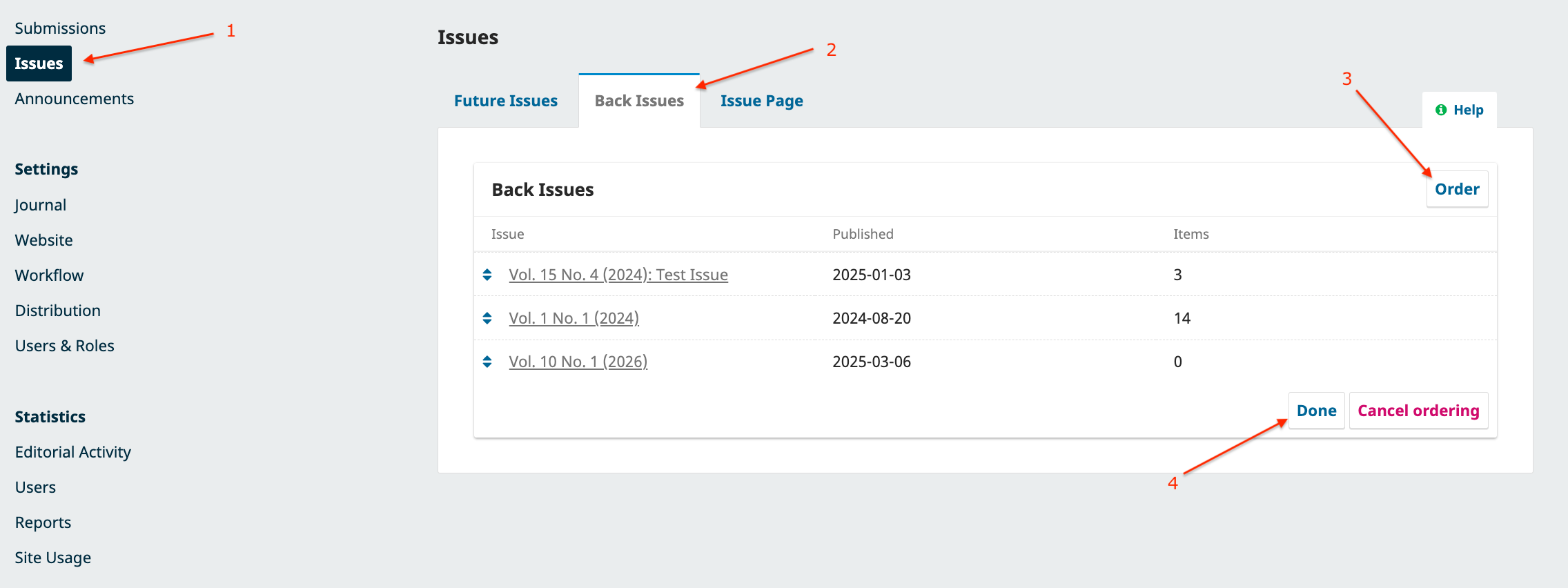 The order in which the issues display on the Issue Archive ([url]/issue/archive) is completely customisable.