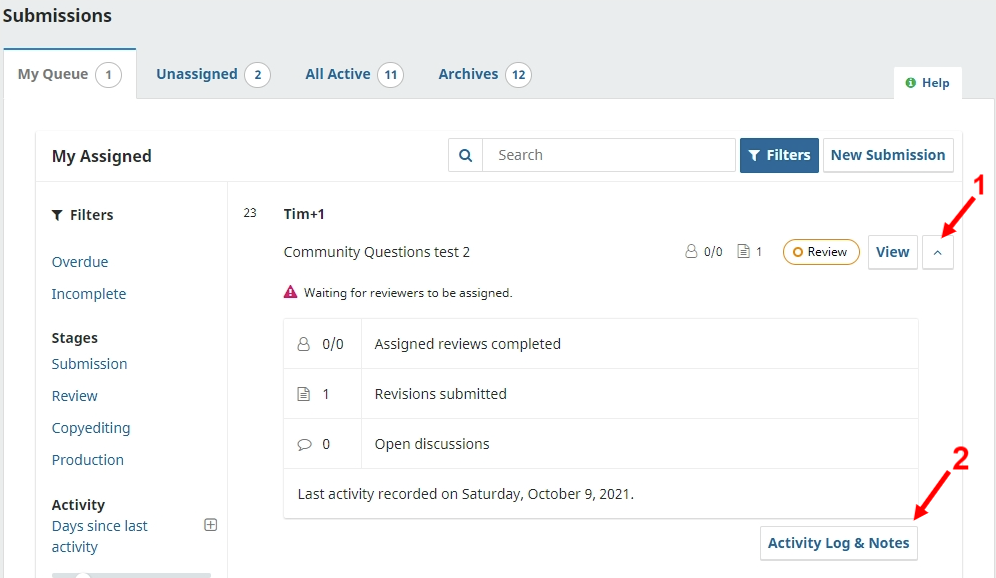 You can do this without having to access a submission, in your ‘Submissions’ dashboard, you bring up a button for a submission’s ‘Activity Log & Notes’ by clicking on the arrow next to the submission’s ‘View’ button.