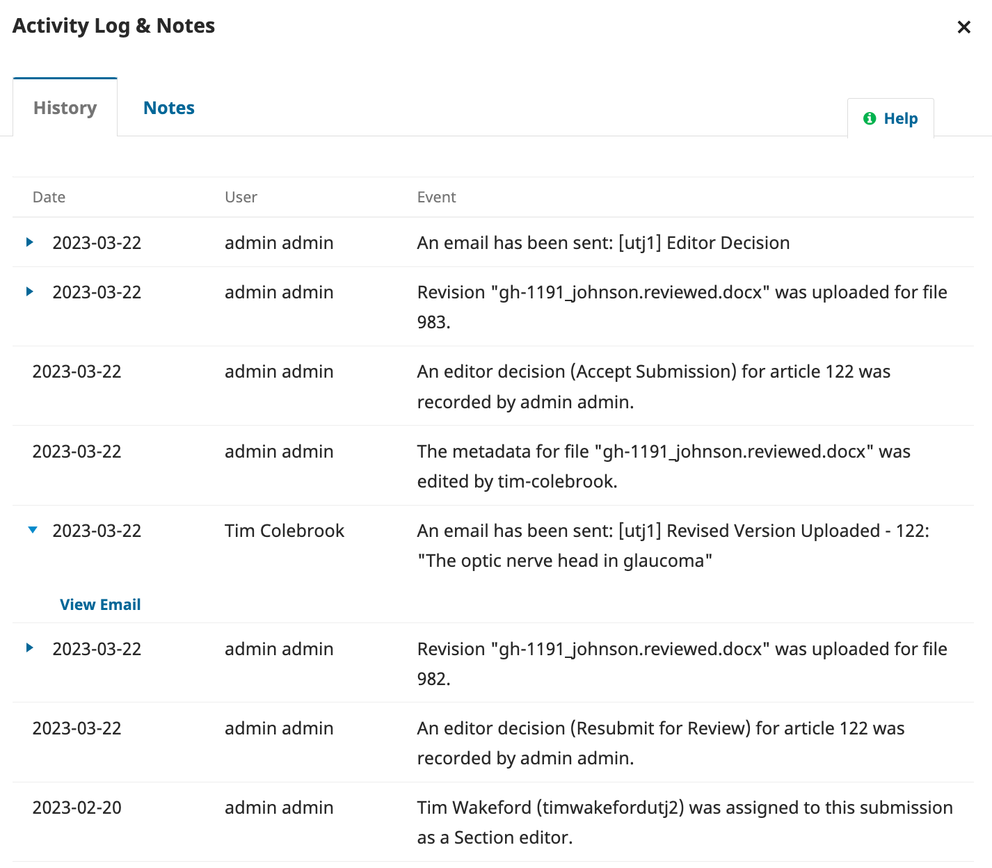 Each submission has a record of all actions performed and all emails sent. This record can be found in the ‘Activity Log & Notes’. The record contains tabs for both the ‘History’ of all actions and emails, and another with any ‘Notes’ created on the submission‘.