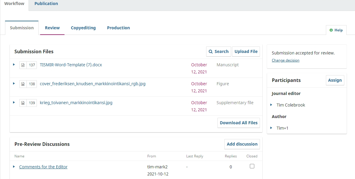 Any new submissions will appear in the ‘Unassigned’ tab and can be accessed by clicking on the ‘View’ button next to the submission. This will take you through to the ‘Submission’ tab where you can view the submission files and view the cover letter, which appear in the ‘Pre-Review Discussions’ section as the ‘Comments for the Editor’.