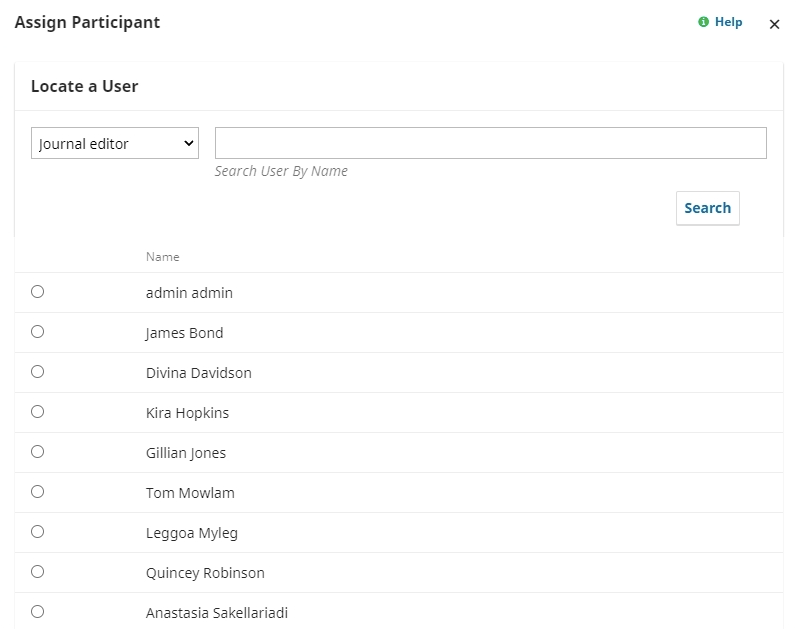 Once you have decided to proceed and are ready to assign an Editor or an Associate Editor to handle the submission, you can add this person in the ‘Participants’ section on the right hand side of the page.