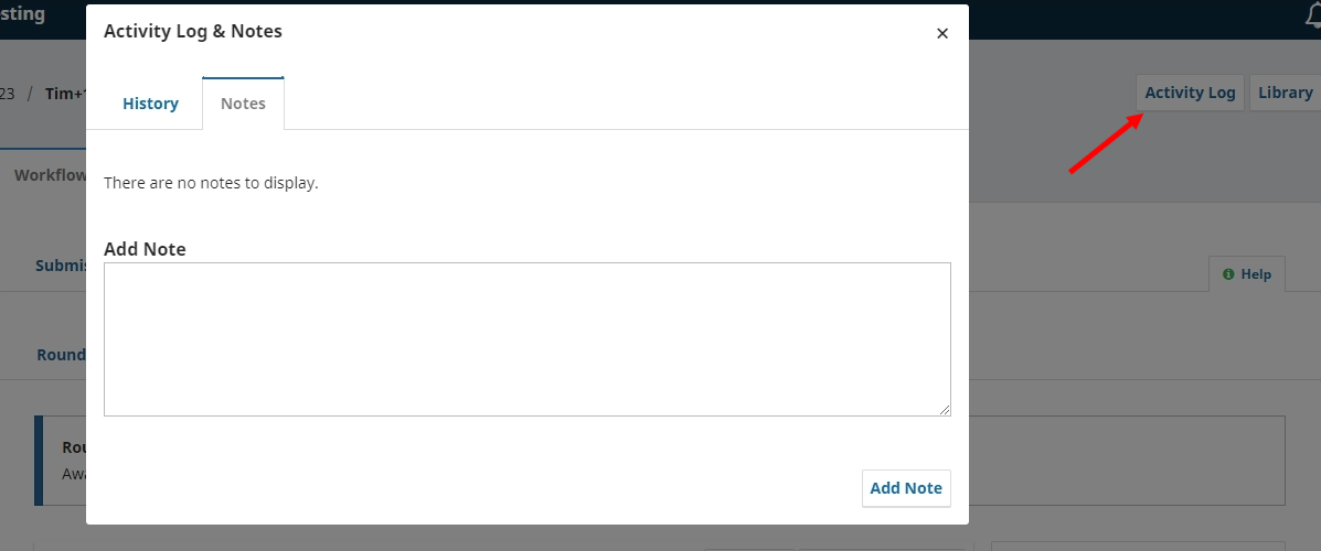To leave a note, click on ‘Activity Log’ in the top right hand corner of the screen, this will bring up a new overlay and you can access the notes tab. Any previous notes will appear here and you can leave your own note by clicking ‘Add Note’.