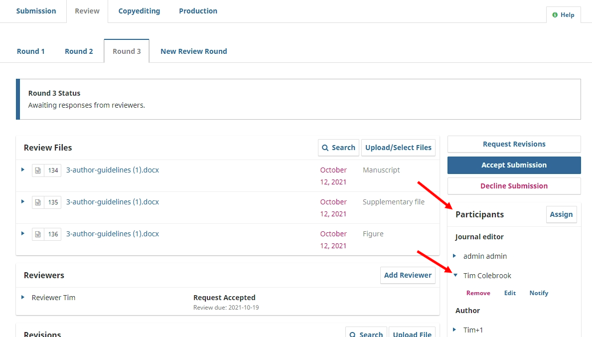 To start a discussion with another editor, you can choose to ‘Notify’ them in the ‘Participants’ panel. This can be found on the right hand side of the tab at each stage of a submissions journey through the OJS system. By clicking on the arrow next to a participant’s name, you can view several options including ‘Notify’.