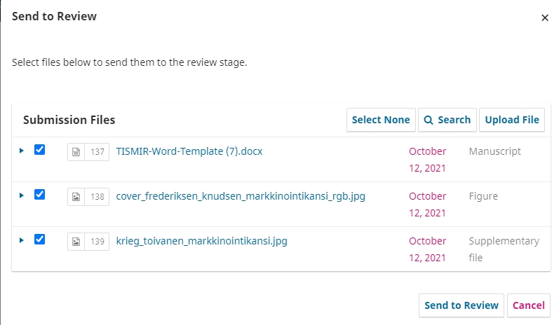 When you begin the first round of review, you will be asked which files you would like to ‘Send to Review’. All of the files originally uploaded by the author will be listed here and you can keep them ticked or choose to untick them.