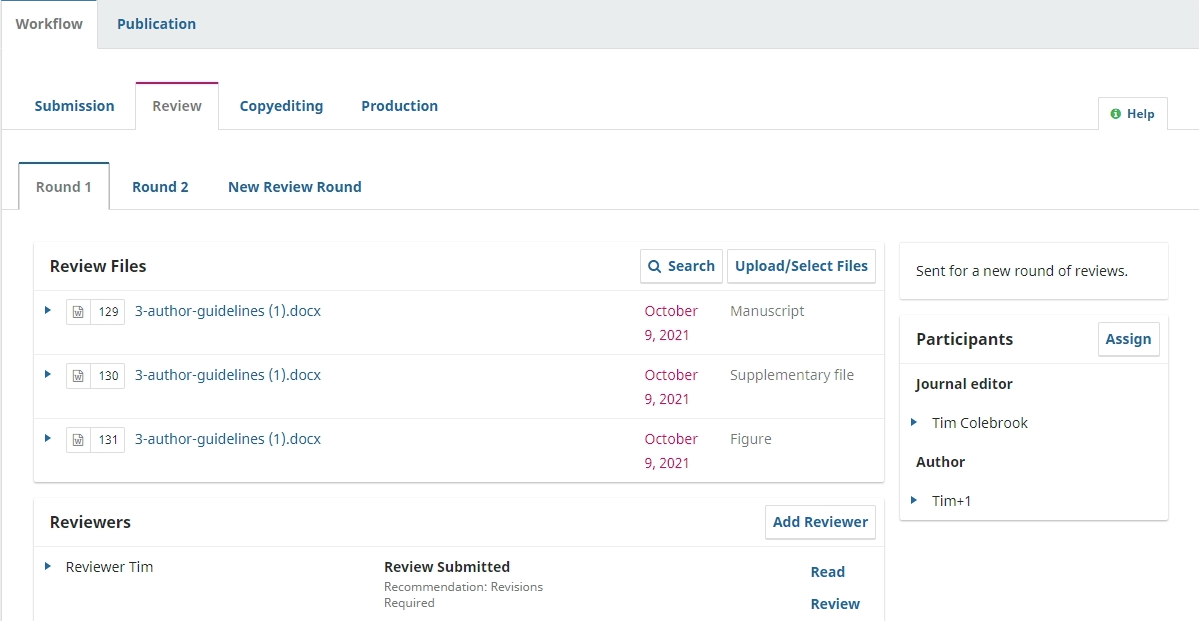 These files will now appear in the ‘Review Files’ in the ‘Review’ tab and are available to be sent out to a new reviewer. N.B. If you are on an additional round of review, i.e. the second or third round, you may want to send a file from a previous round out for review, e.g. a supplementary file that wasn’t changed during revisions. If so, you can search for these files by clicking ‘Upload/Select Files’ and ticking the box ‘Show files from all accessible workflow stages’.