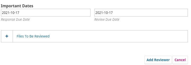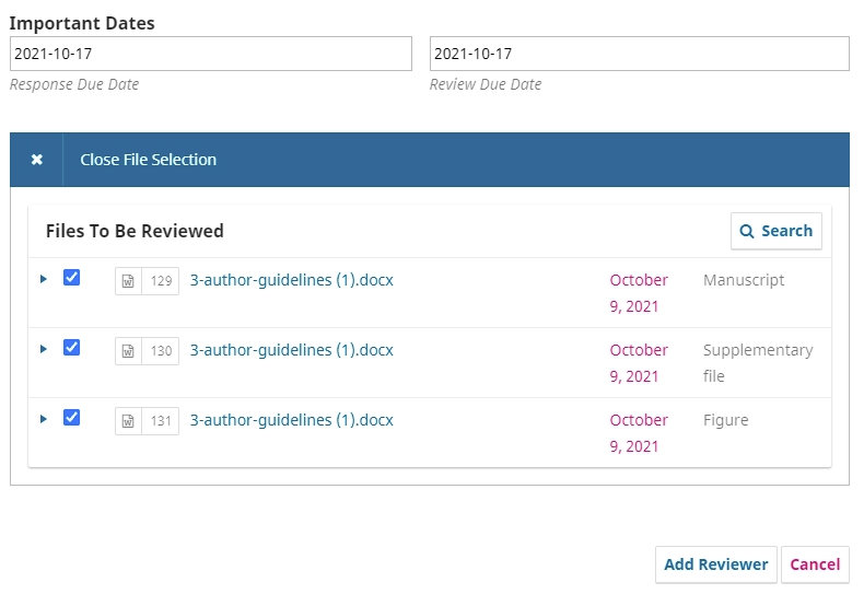When you want to invite a new reviewer, you choose the reviewer you wish to invite by clicking ‘Select Reviewer’ and this will open the invitation template. Beneath the text box you will have the option to choose which files will be visible to the reviewer. Unless you choose otherwise, all files uploaded in the ‘Review Files’ section will be available during the review process. To see these files, click on ‘Files To Be Reviewed’.