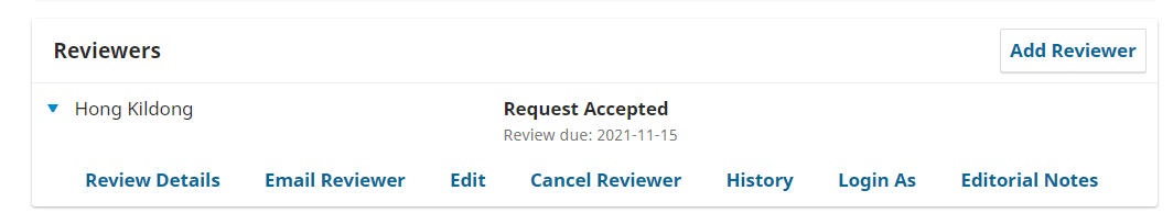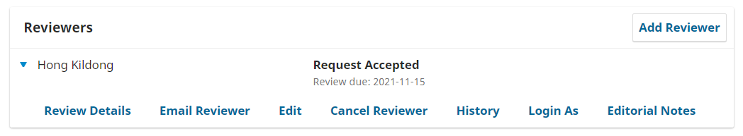 Once a peer reviewer has formally agreed to complete the review, the deadline for their review feedback is indicated as 'Due' to the right of their name, underneath the notice that they have accepted the review request.