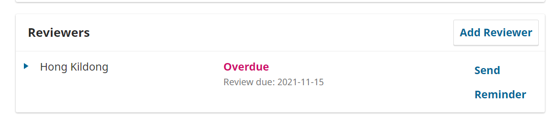 To send a manual reminder after the deadline, the process is a little different. Once the review is overdue, this will display next to the reviewer’s name: