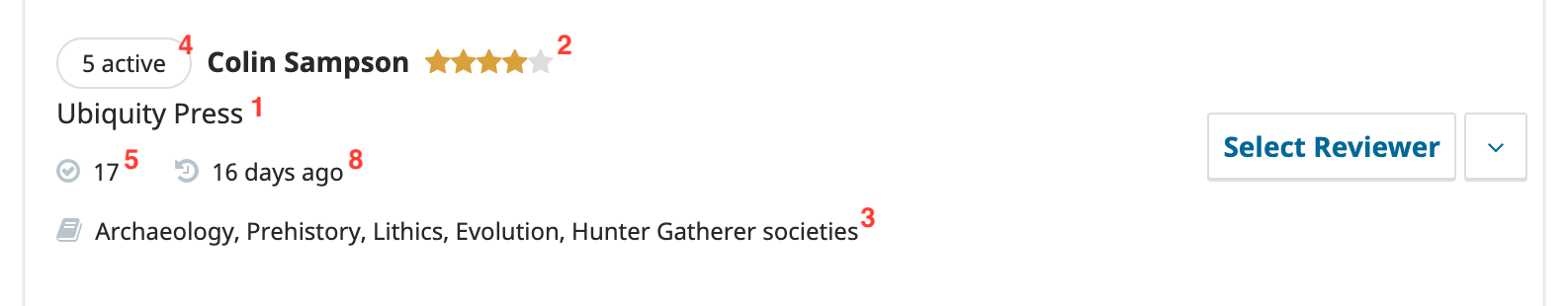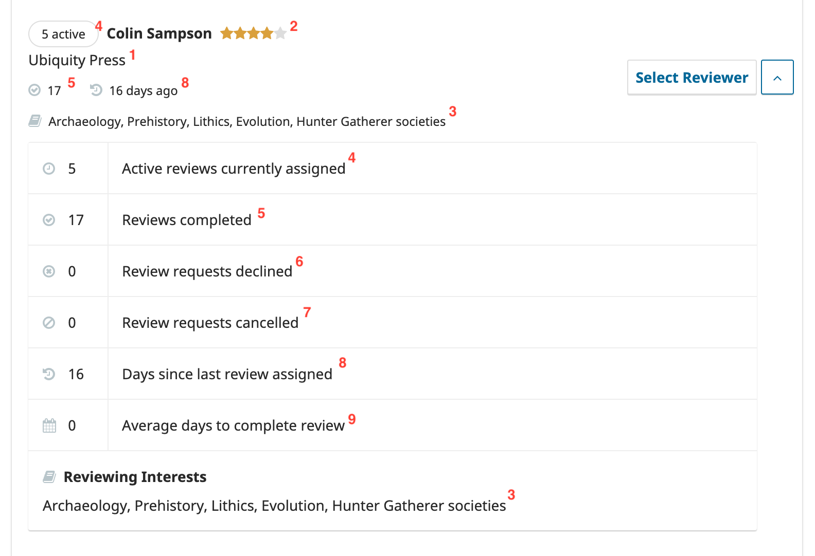 When assigning a reviewer to the review task, the editor will be presented with a list of potential reviewers already in the journal system. This will include data on their user profile and historic review history, including: