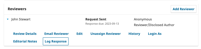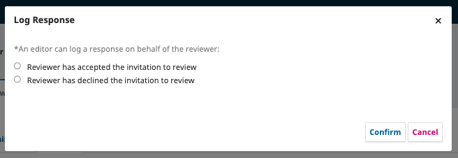 When a peer-reviewer is invited to a review task, ideally they log their decision to accept or decline the invitation directly within the journal system, which they can access via a link in the invitation email. However, if a reviewer replies to the editor directly to provide their invitation response, the editor is able to log it on their behalf. To do this, the editor must: