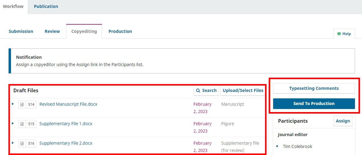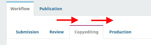 In the submission, this means that we will need to go through the copyediting tab and move the accepted files into the production tab. Even if your journal uses the Ubiquity copyediting service, this will only happen once the files have been sent to production and so you will need to follow the same steps.