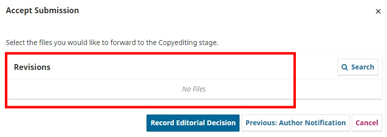 When you accept an article you will be taken through two steps, the first is drafting the email notification to the author, and the second is selecting the files to send to copyediting. Please note that you will only be able to select files that have been uploaded in the revised files panel of that round of review. If no revisions have been uploaded or you are missing some files (e.g. supplementary or data files that were not revised), then this is not a problem, simply complete this step as we can upload everything in the copyediting tab.
