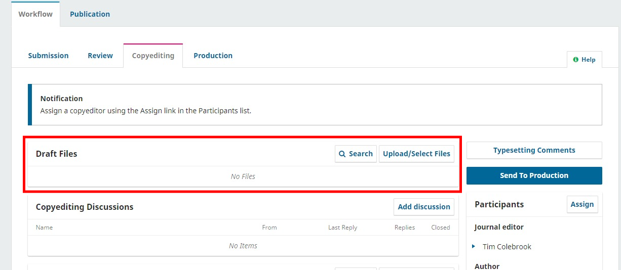 Once a submission has been accepted, it will be moved into the copyediting tab. What we now need to do is ensure that all of the accepted files are uploaded into the “Draft Files” panel as this will mean we can select them when we click “Send To Production”.
