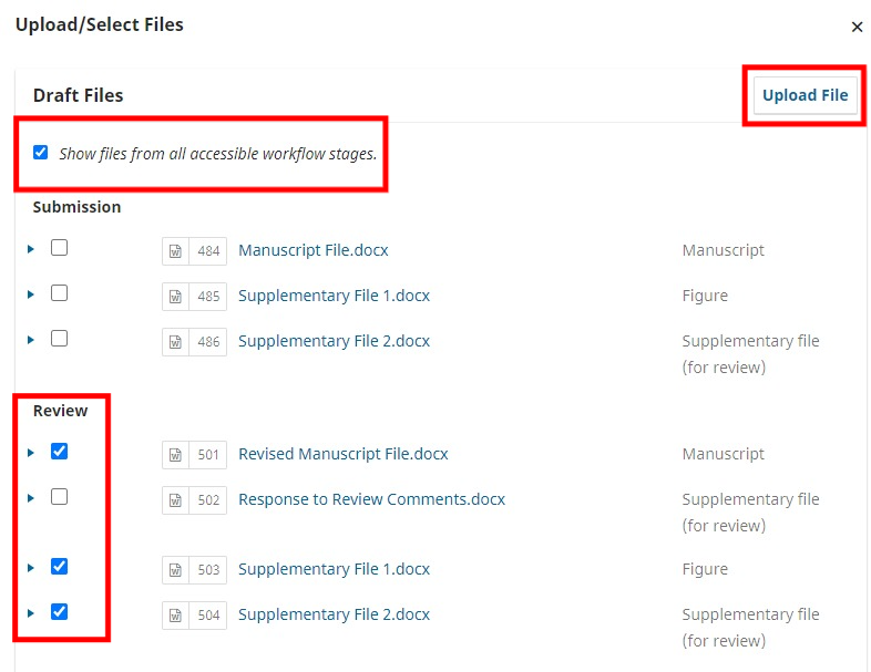 To do so, we are going to click “Upload/Select Files” and make sure that the option “Show files from all accessible workflow stages” is ticked. This will allow us to select any files that have been uploaded in either the submission or review stages and means we can double check that we have every file that should be part of the final publication. If you are missing any files, you will also be able to upload a brand new file when you click “Upload/Select Files”.