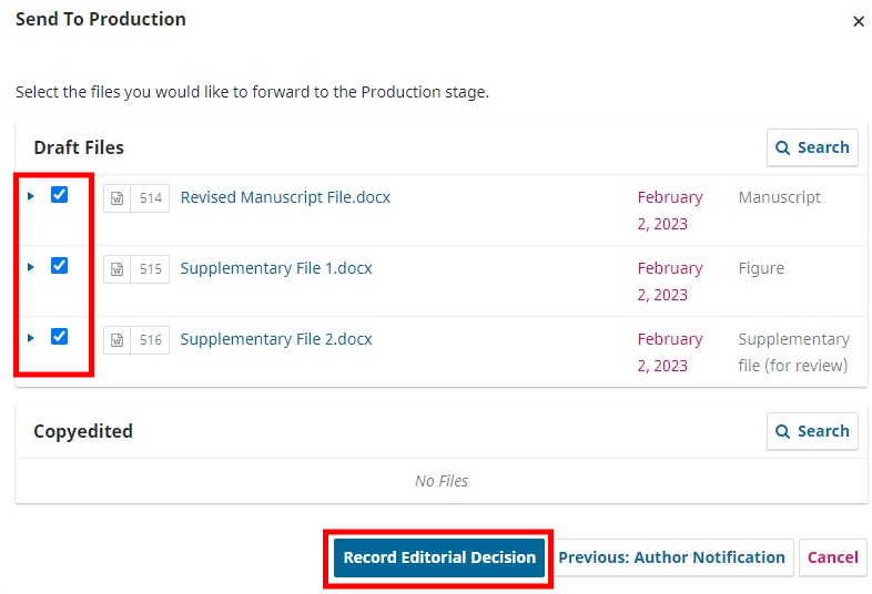 We can then complete the final stage and send the submission to production, this is another two step process, the first is notifying the author, however it is quite normal to skip this email if there is nothing new to add from the acceptance email. The second is selecting the files and you should now be able to see and select the files you have uploaded into the “Draft Files” panel. Ensure these are all ticked and then click “Record Editorial Decision”.